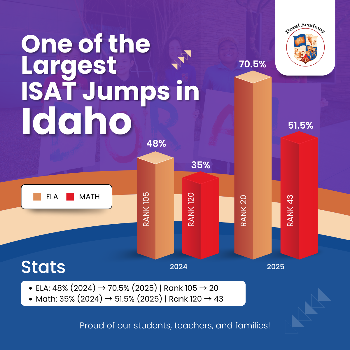 These results place Doral Academy of Idaho firmly on track toward its next goal: Top 10 in ELA and Top 20 in Math.