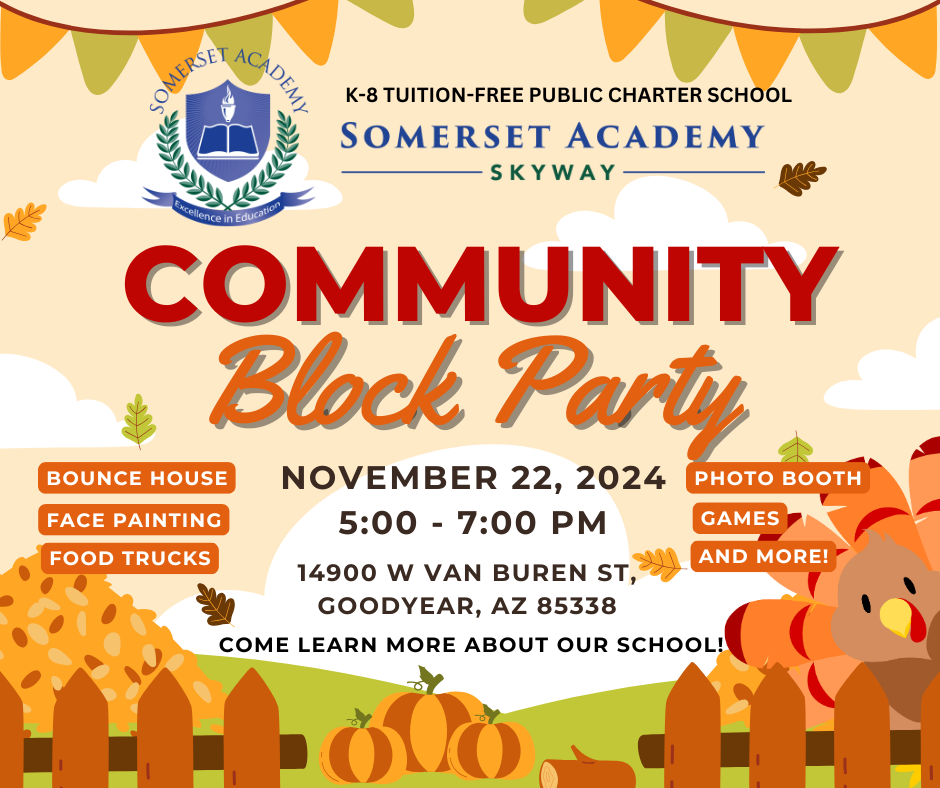 Goodyear, AZ – November 18, 2024 - Somerset Academy Skyway invites families and community members to come together in the spirit of Thanksgiving and celebrate the power of community at their Community Block Party on Friday, November 22, from 5:00 PM to 7:00 PM, at 14900 W Van Buren St, Goodyear, AZ 85338.